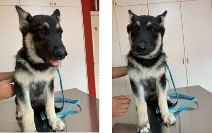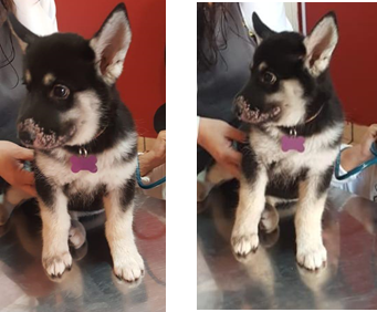 Mira las fotos de este caso, BONNIE. Es una alergia alimentaria (Pescado) que se manifiesta dermatológicamente. Observa el cambio de su piel en el hocico, Bonnie presentaba edema en labios y prurito grado 10 y alopecia.
